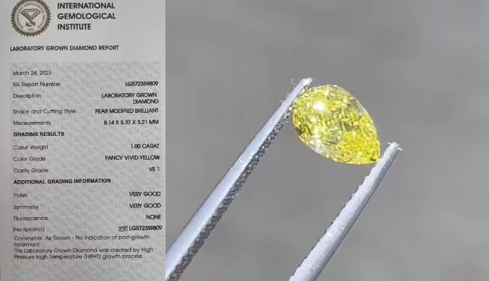 페어 로즈 다이아몬드, 화려한 밝은 노란색, VS1, 우수한, IGI 인증